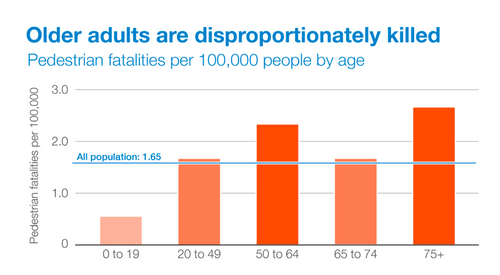 Additionally, the risk of injury is not evenly distributed. Pedestrians aged 70+ or those who are disabled are most susceptible to serious injury if struck in an accident. Pedestrians in lower income neighborhoods are also more susceptible to fatalities if an accident occurs.