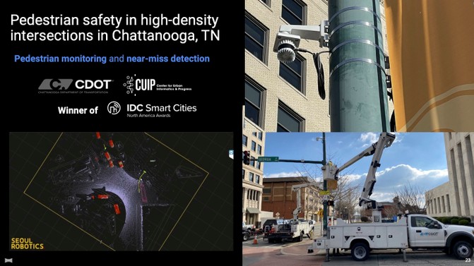 We worked with one of our software partners, Seoul Robotics, the city of Chattanooga, TN, and a local university to deploy digital lidar for pedestrian monitoring and near-miss detection on a high-traffic corridor. The high-compute data analysis is run on NVIDIA processors and is used by the city to improve traffic and pedestrian safety, as well as inform transportation infrastructure.