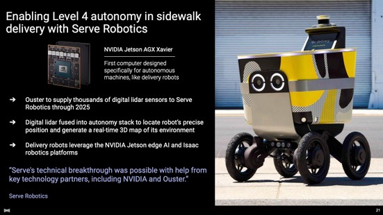 Serve Robotics is another mutual customer that demonstrates how Ouster comes together with NVIDIA. Serve’s sidewalk delivery robots use the NVIDIA Jetson edge AI and Isaac robotics platforms with an OS digital lidar sensor, which has helped Serve complete the first commercial Level 4 autonomous sidewalk delivery on the streets of Los Angeles earlier this year.