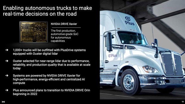 Plus is using the NVIDIA DRIVE Xavier chip and DriveWorks SDK to process digital lidar data from hundreds of thousands of miles driven with their PlusDrive system. The PlusDrive system is actively deployed today on Amazon trucks in the U.S.