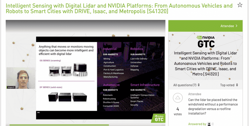 Feel like you missed out? It’s not too late to learn about what Ouster digital lidar and NVIDIA can do for your intelligent solutions. To catch the replay, register for free at www.nvidia.com/gtc/ and look up Angus’ session (S41320).