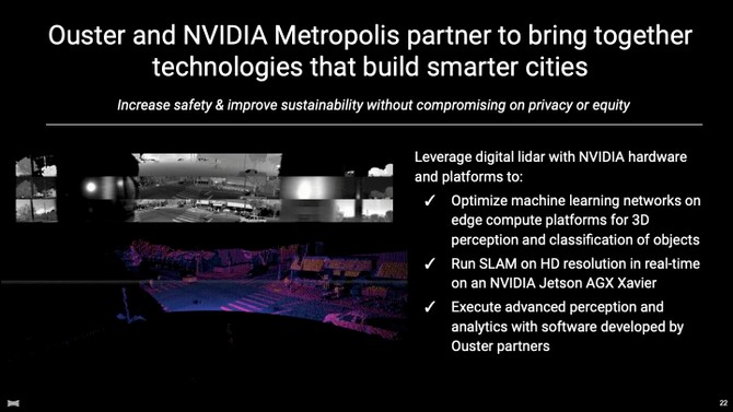 Today, we have over 40 software partners and system integrators, many of which use NVIDIA hardware to process lidar data, create real-time SLAM (simultaneous localization and mapping) models, and perform 3D perception and advanced classification for objects.