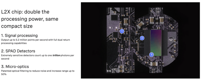 Capable of counting up to 1 trillion photons per second, and outputting up to 5.2 million points per second , the L2X system-on-chip (“SoC”) continues our journey along the Moore’s Law curve by doubling the maximum data rate of our sensors. The L2X handles all the logic and signal processing on the sensor, and can now process both the strongest and second strongest returns of light for each pixel.