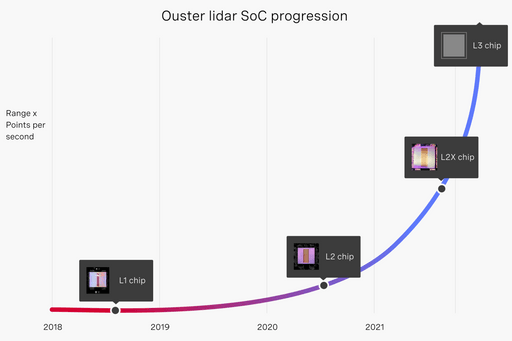 Since launching the OS1-64 in 2018, we have already doubled the resolution of our sensors in just two years, from 64 to 128 channels with our L2 chip to develop the highest resolution digital lidar on the market. The L2X chip doubles our performance yet again, continuing along our CMOS SoC roadmap and demonstrating the exponential improvement potential of digital lidar.