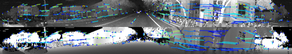 On careful inspection, it’s clear that the network is picking up different key points in each image. Anyone who has worked on lidar and visual odometry will grasp the value of the redundancy embodied in this result. Lidar odometry struggles in geometrically uniform environments like tunnels and highways, while visual odometry struggles with textureless and poorly lit environments. The OS1’s camera/lidar fusion provides a multi-modal solution to this long standing problem.