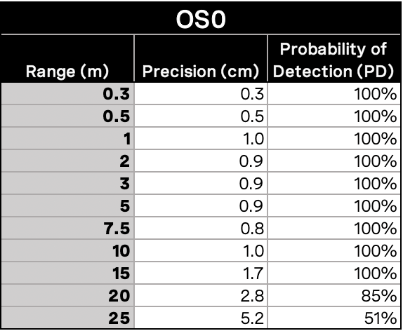 We demonstrate the precision of the OS0 here on a 10% target over a 25 m range. As you will see on the table below, the sensor achieves precision of ± 0.5 cm at a range of <1 m, and that precision decreases up to ±1 cm at a range of 1 meter. As the target moves beyond 1 m away from the sensor, precision improves to ±0.9 cm for ranges between 1 – 10 m. Beyond 10 m, precision decays geometrically out to a maximum of ±5 cm at 25 m.
