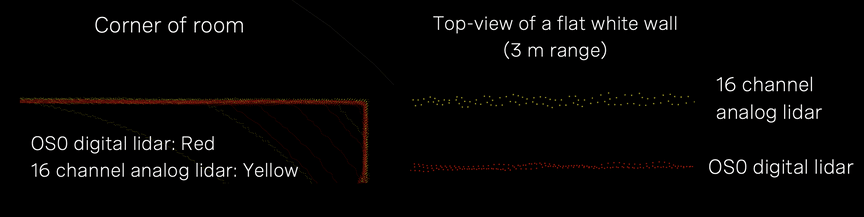 We also test for linearity and any distortion or “bend” in the walls. In the images below, you can see how the walls captured by the OS0 have a thinner profile than the leading mid-range 16 channel analog sensor on the market.