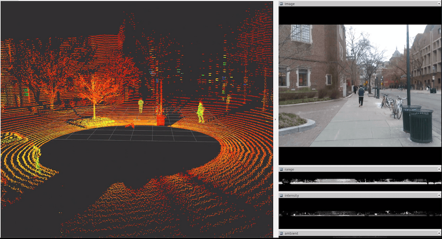“What first stood out to us was the ease of use and integration. It takes about 10 minutes to go from taking the OS1-64 out of the box to having it stream a nice point cloud to you on Rviz” said Shreyas. A quick test outdoors with a color camera fusion also demonstrated how easy it was to discern objects from the point cloud alone.
